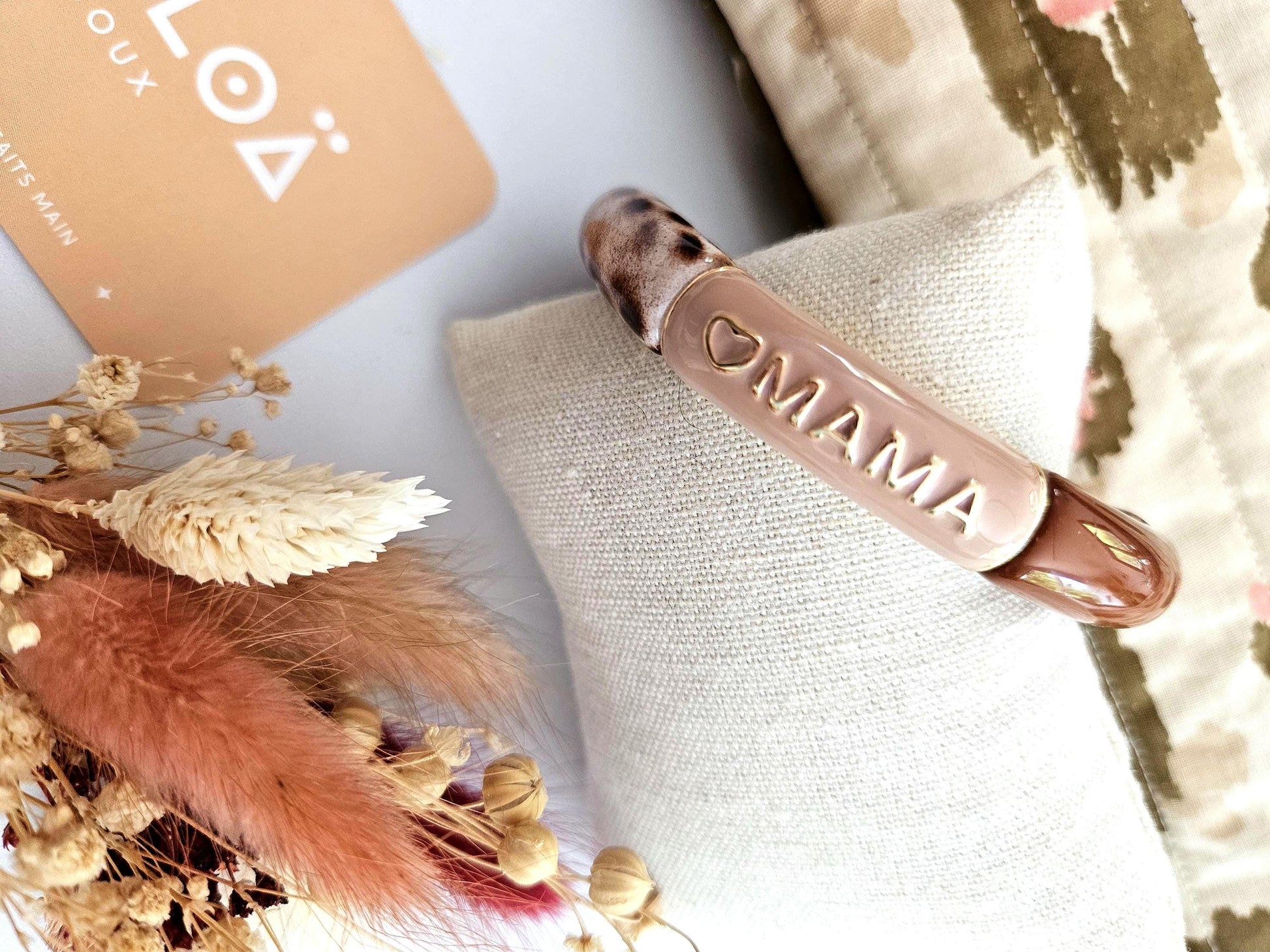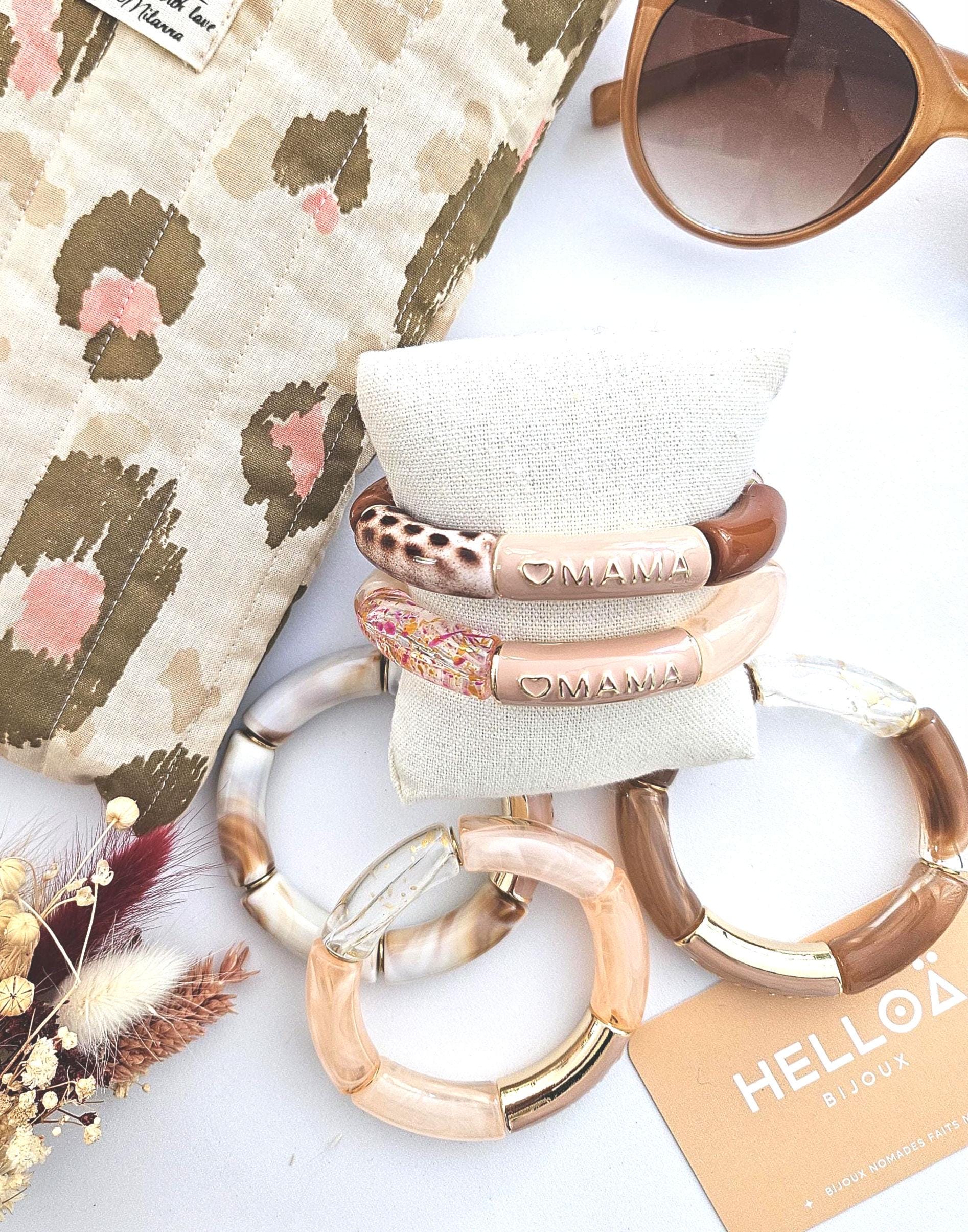 Tendance : Bracelets joncs tubes perles acryliques incurvées, perle tube centrale émaillé "mama" et perles d’espacement en acier doré.