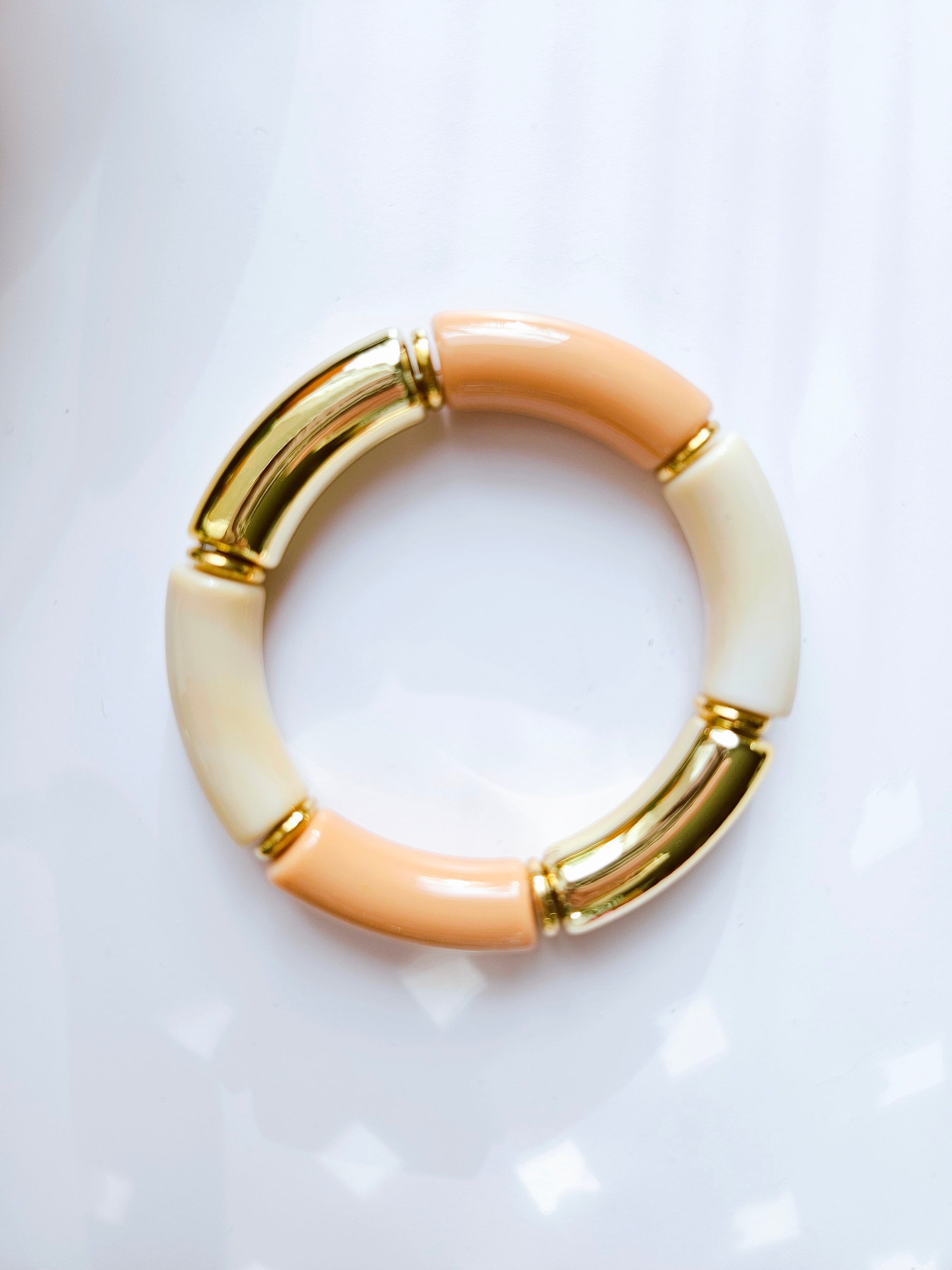 🌟Tendance : Bracelets joncs tubes perles acryliques incurvées dorés terracotta et crème. Montés sur fil elastique avec perles espacement en acier.