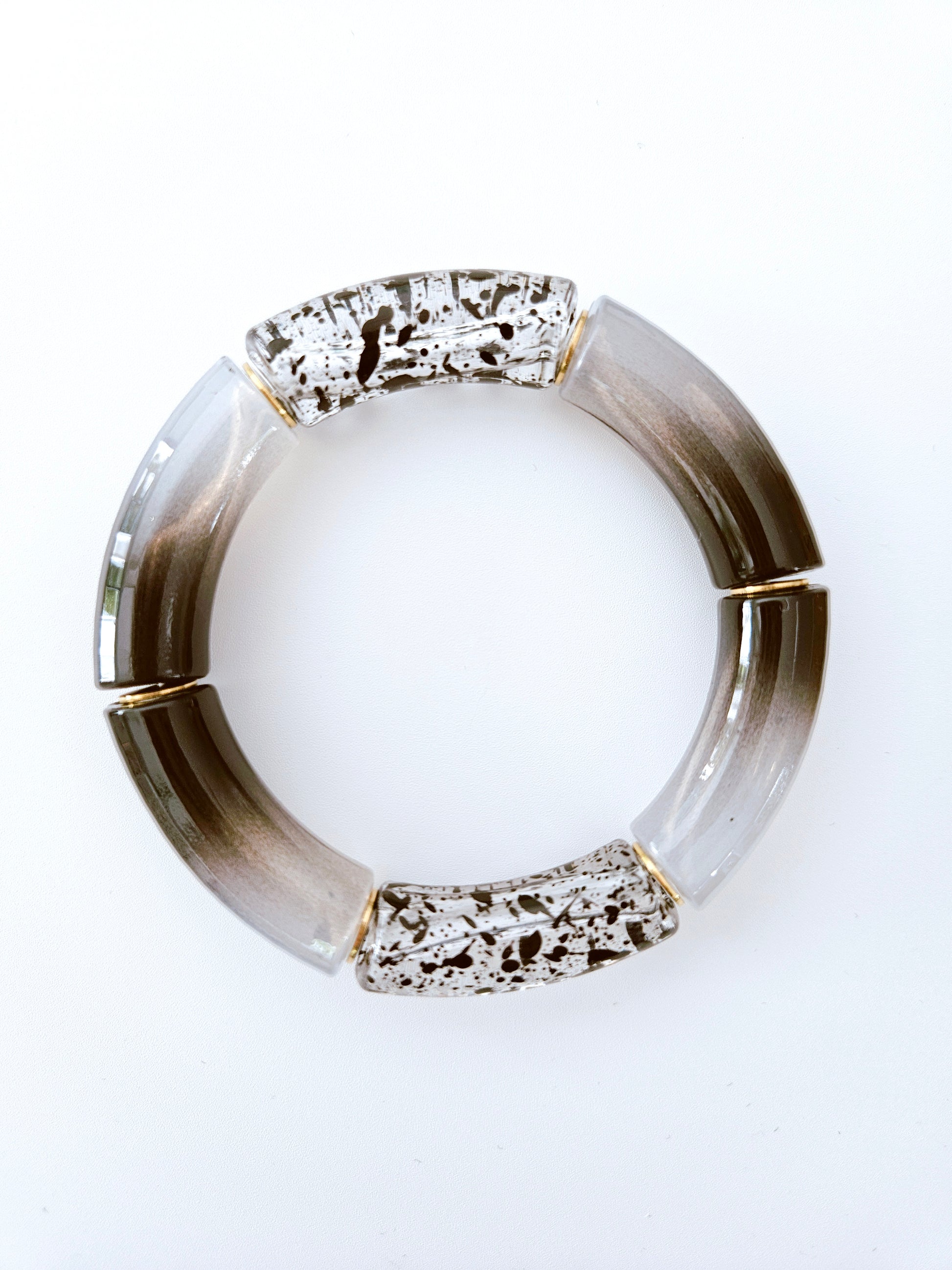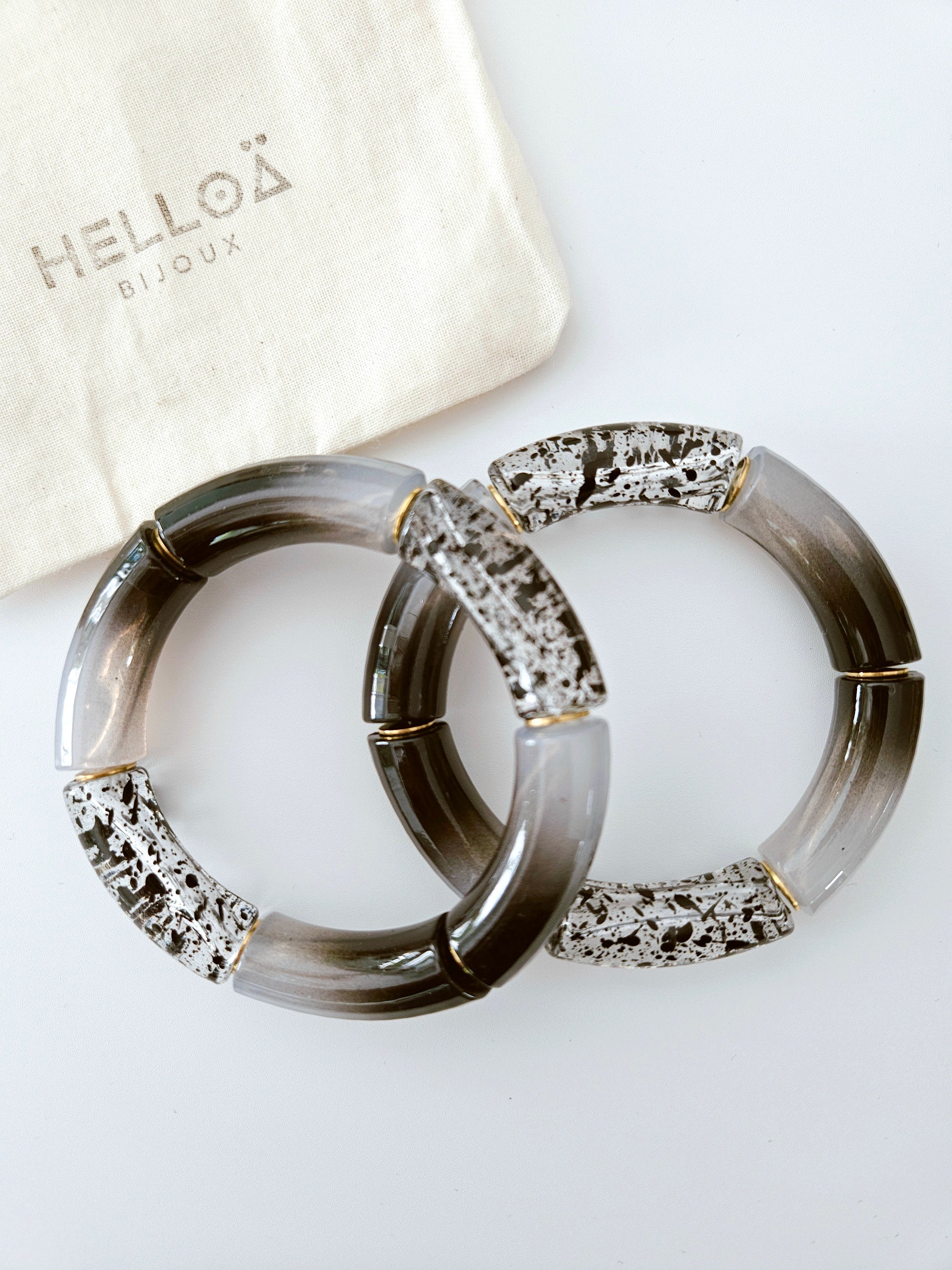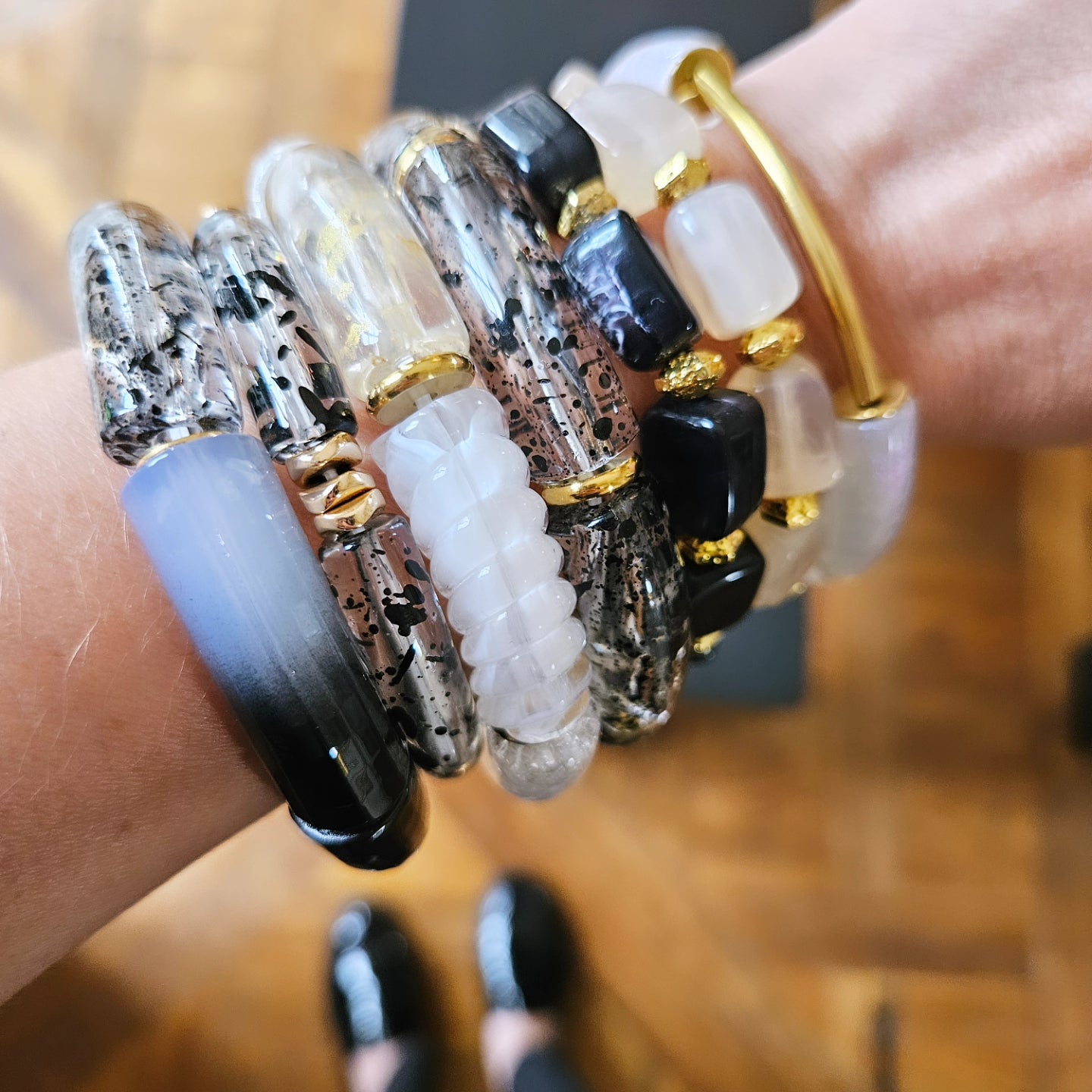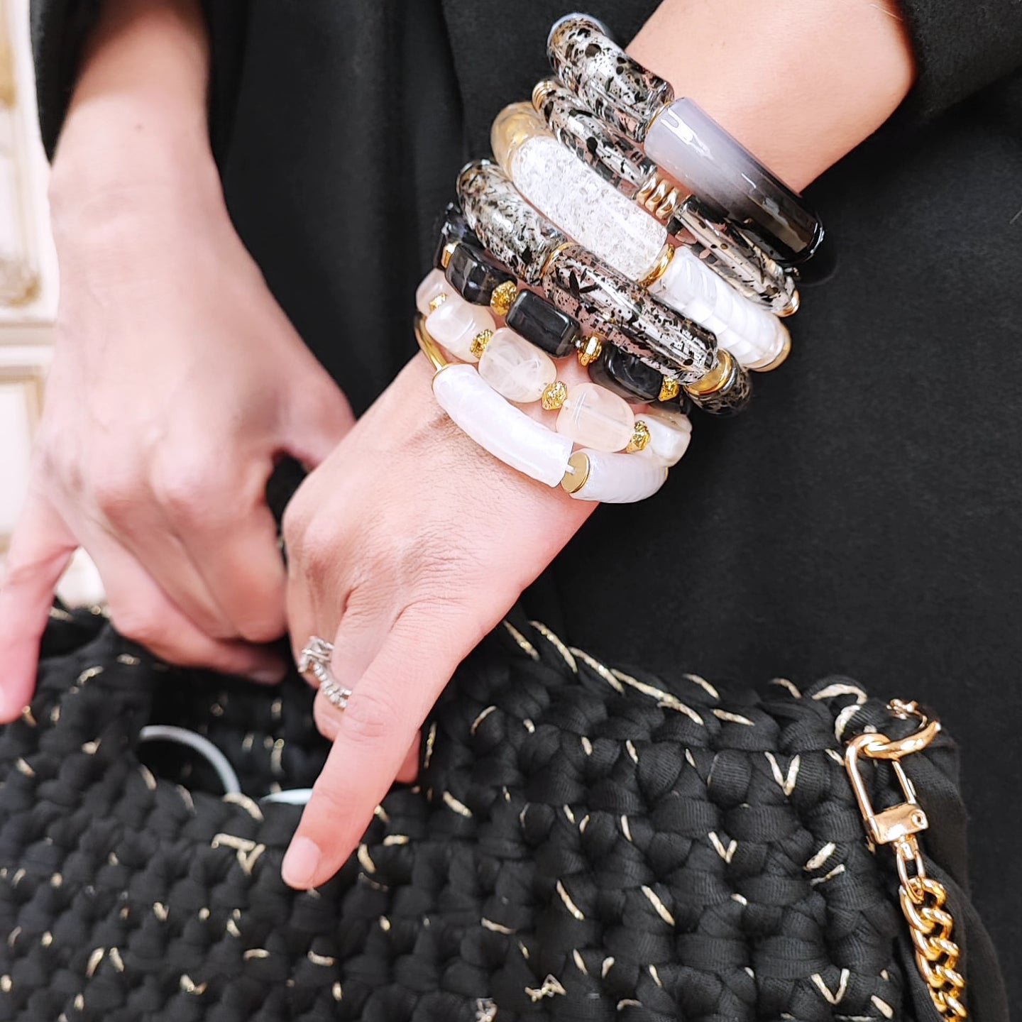 🌟Tendance : Bracelets joncs tubes perles acryliques incurvées. Montés sur fil elastique avec perles espacement en acier.